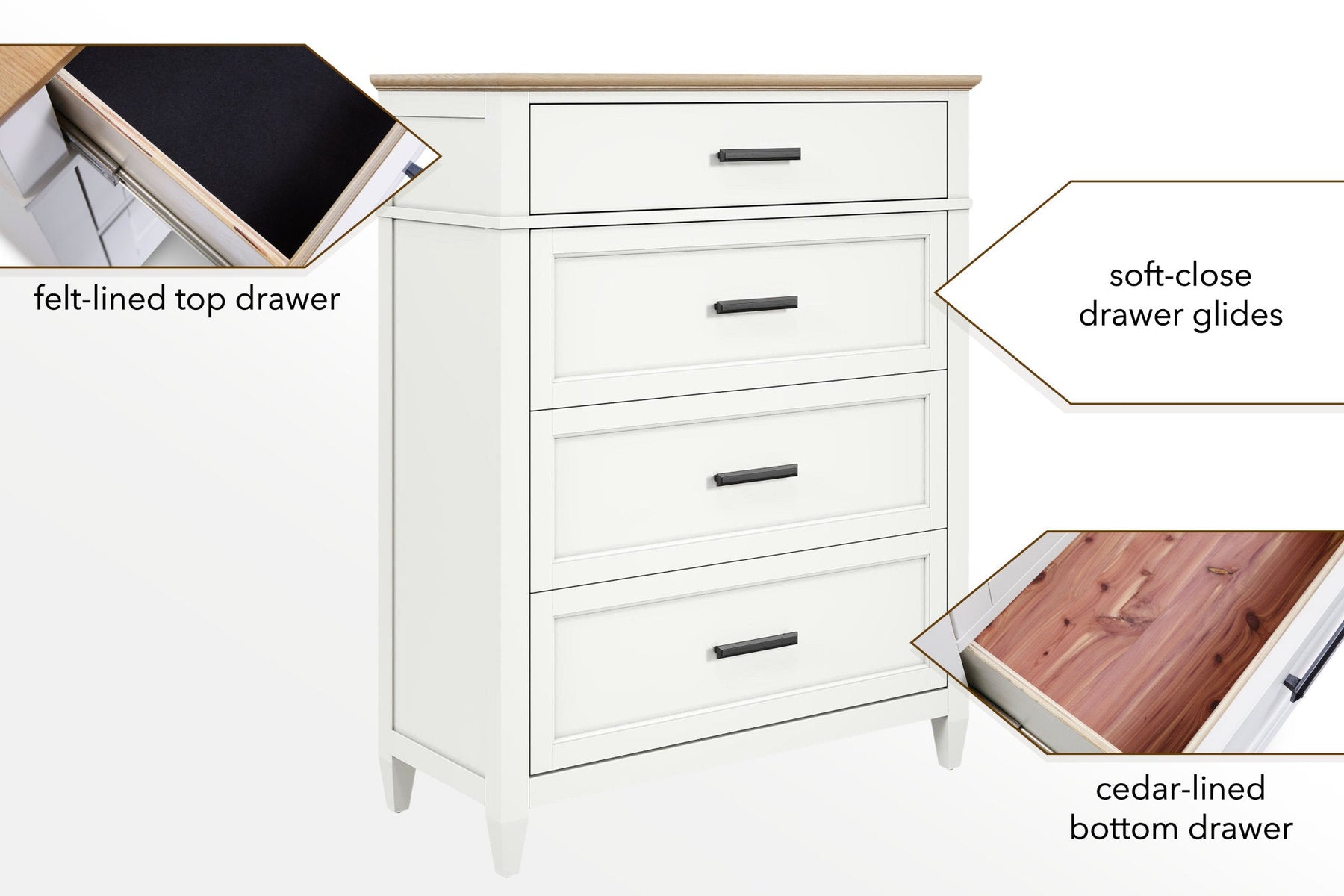 - Crafted from premium poplar solids in a linen finish topped with warm oak accents