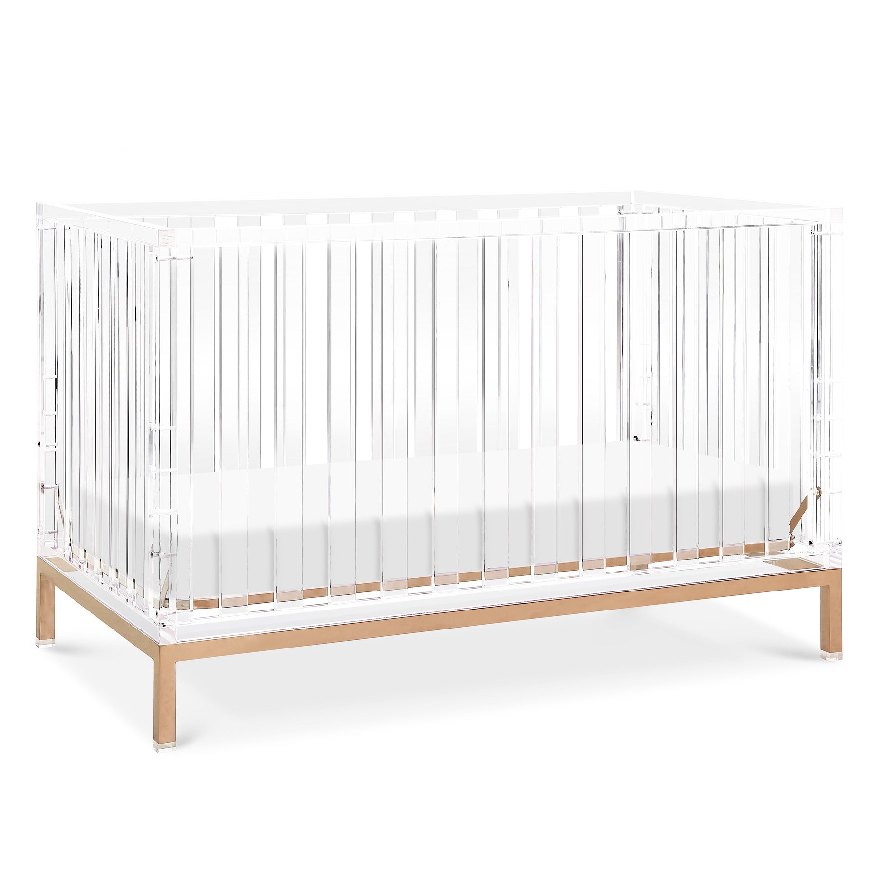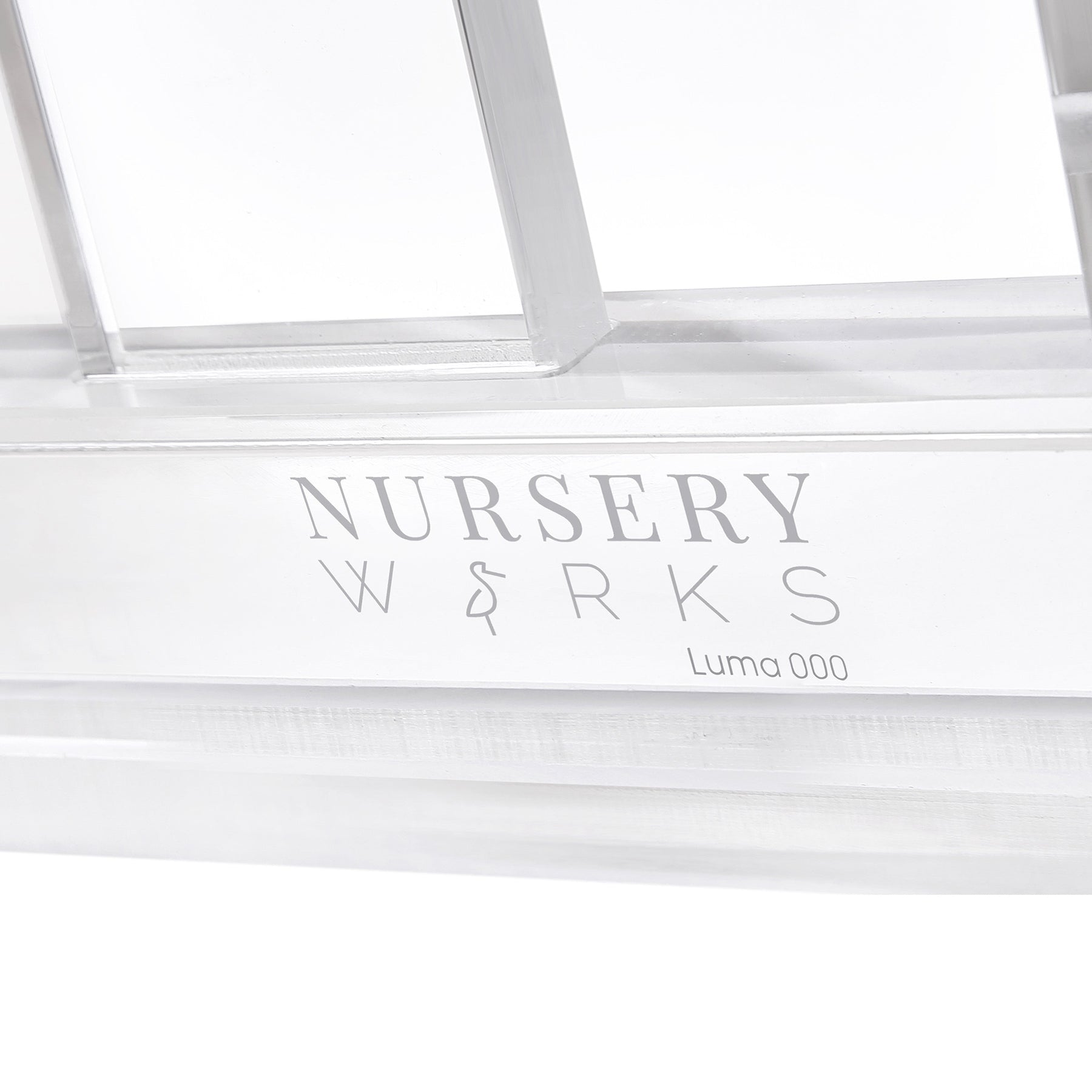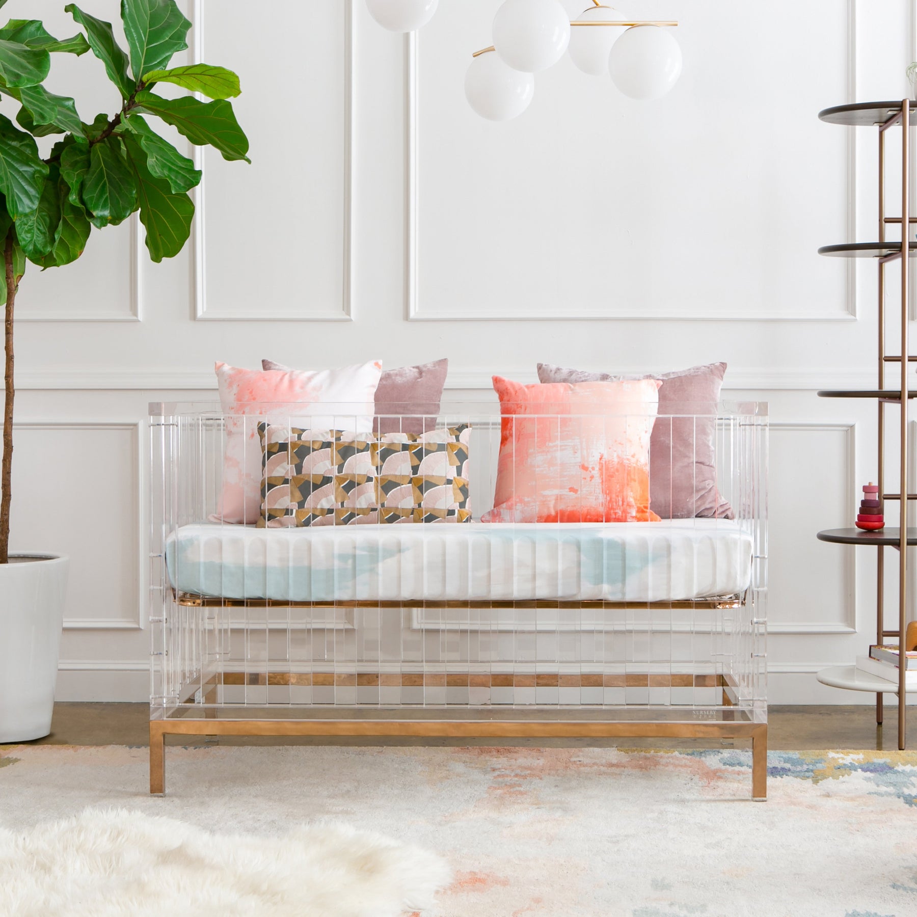 The Luma Crib seamlessly integrates form and function in the nursery space. The crib marries our signature acrylic aesthetic with an au courant rose gold touch. With four clear sides perforated by defined slats, the Luma creates an airy space for baby to play, relax and sleep, and allows you to have a clear view of baby from anywhere in the nursery.