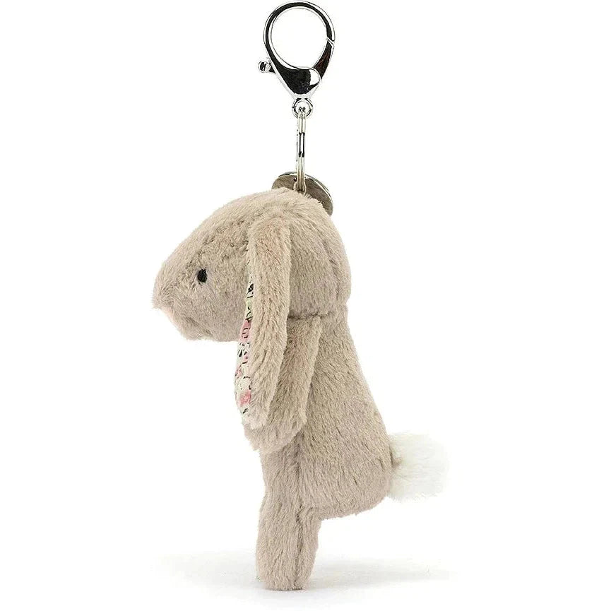 Put a hop in your step wherever you go with the Blossom Beige Bunny Bag Charm! This bouncing charm is beautifully soft, with praline fur, a fluffy cream bobtail and ditsy-print ears in blush, white and moss. With a silver chain, claw clip and Jellycat tag, this bunny makes any bag bonny.