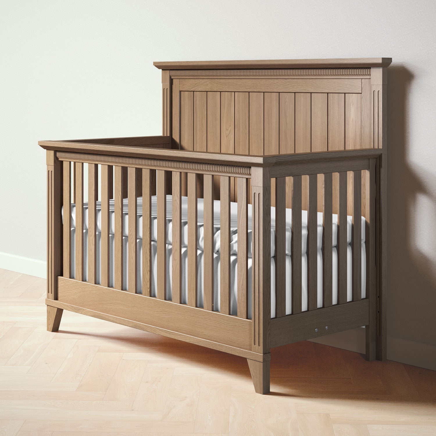 A Modern Farmhouse with superb architectural details, Edison is designed to grow along with your family. Subtle dentil mouldings, sculpted legs or the paneled headboard are adding substance and timeless elegance. This 4-in-1 convertible crib, is made from solid wood for strength and longevity, and finished in non-toxic paints and stains.
